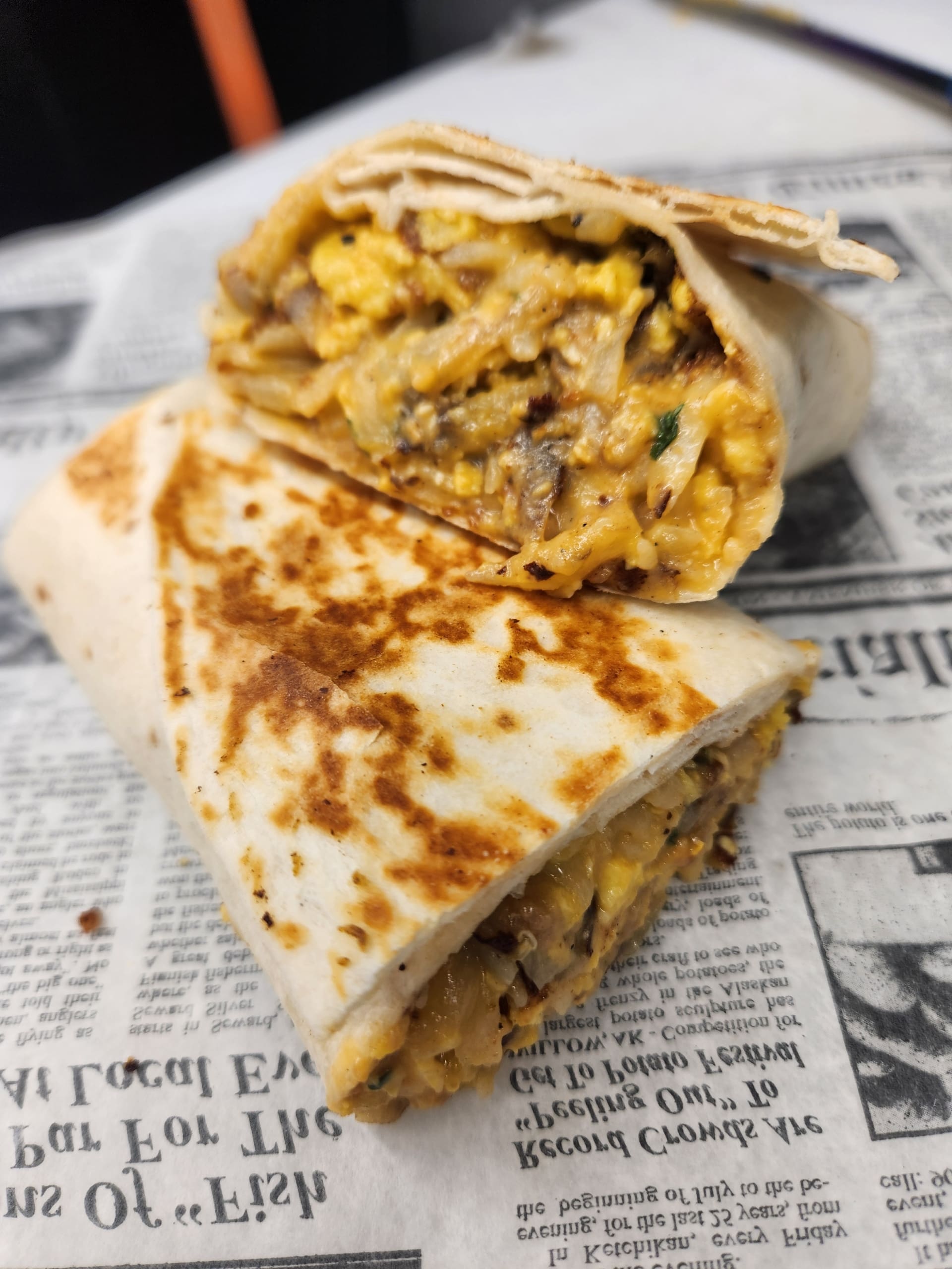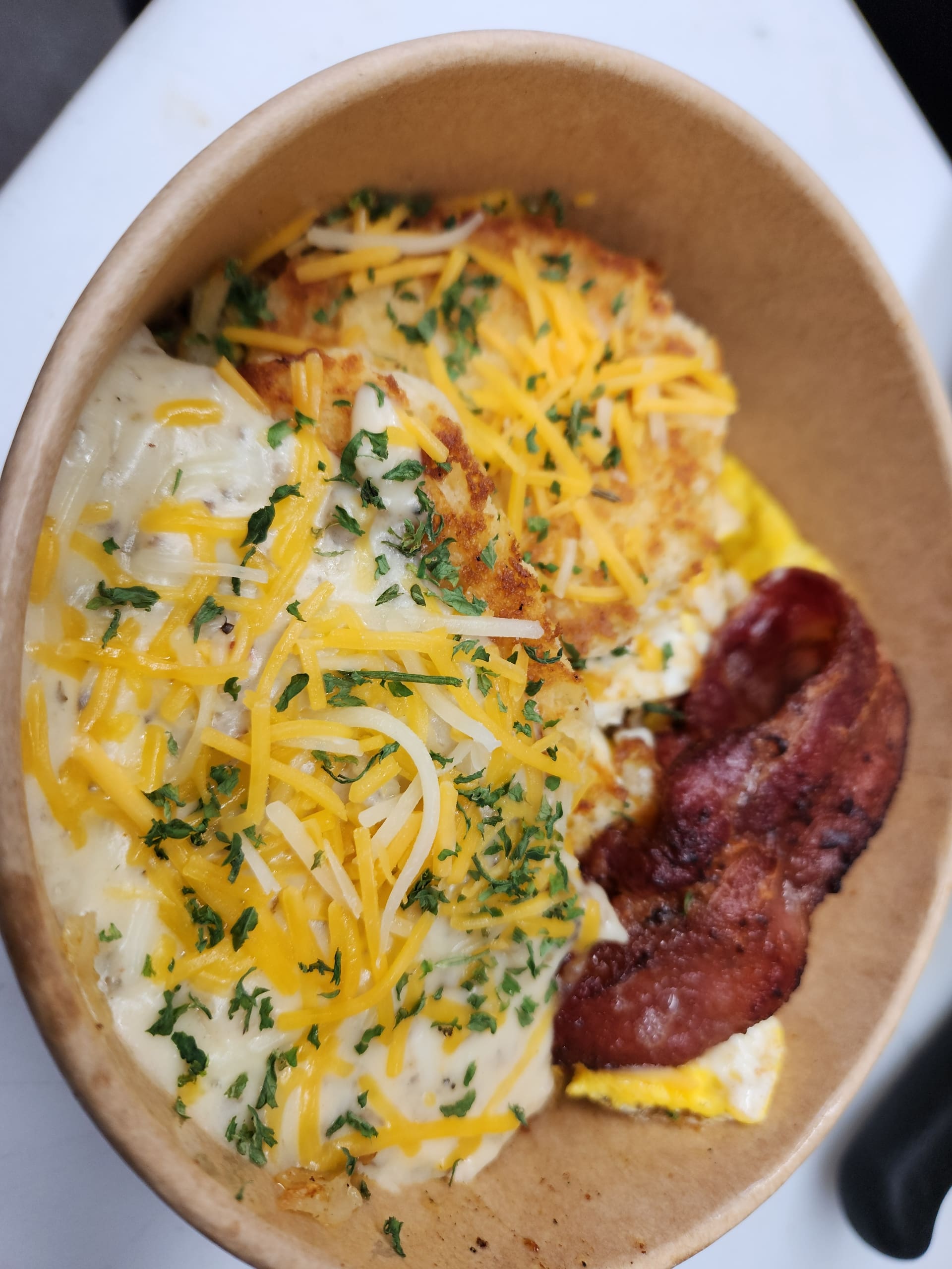 LOADED BREAKFAST BOWL- Hashbrowns, scrambled eggs, gravy, cheese, and bacon served with a biscuit